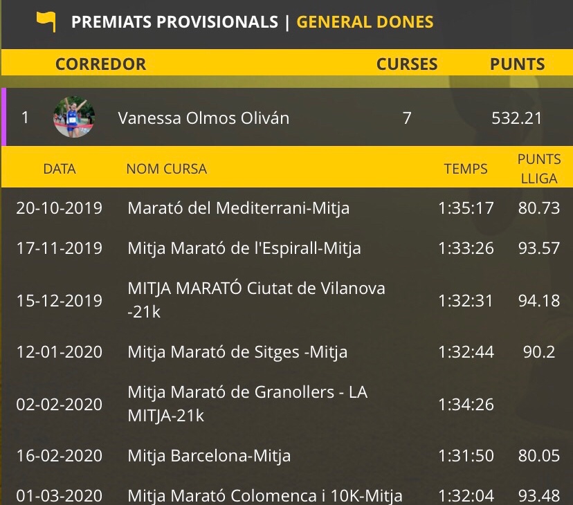 Ya llevaba 7! Y los tiempos no estaban del todo mal… así que tenía opciones claras de optar a premio y me satisfacía haber hecho un buen papel como Ambaixadora de l’Esport. Quería hacer alguna media más para mejorar… pero de repente, el COVID19 se coló en nuestras vidas y todo paró… las carreras se empezaron a anular, y las zancadas se conviertieron en entrenos indoor…